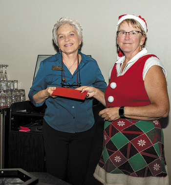 ← Banquet Manager Sharon Evans is thanked by MPWGA President Lori Stegink.