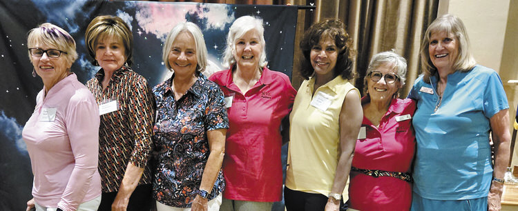 The first-place team was Sandy Strack, Dar Pittman, Lori Bolme, and Jim Bolme. Second place was Fira Stout, Cherie Haydock, Ginny Shockey, and Kevin Shockey. Third place was Sandy Valeton, Anne Everett, Ruth Sollin, and Dan Sollin. Annette Moyle had the lowest women’s score (37), and Jim Bolme had the lowest men’s score (38). Six participants had two holes-in-one, and three teams tied with three holes-in-one each.