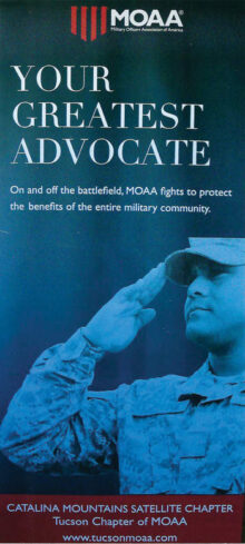G. William Myers (Lt., CEC, USN Former) The Catalina Mountains Satellite Chapter (CMSC) of the Military Officers Association of America (MOAA) is ending its summer hiatus and will resume monthly meetings on Oct. 16 at 11:30am in the east dining room of the Bistro Restaurant, located at the MountainView Clubhouse in SaddleBrooke. The east dining room entrance…