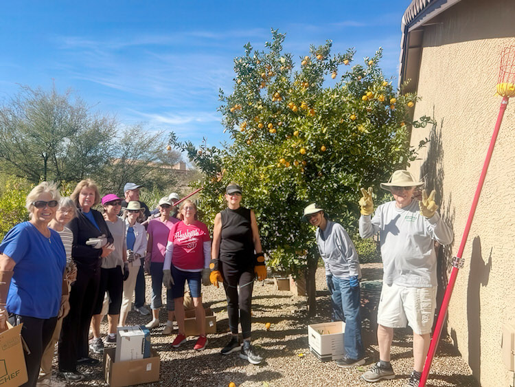 In past years during the late winter and early spring, you may have seen a caravan of cars and carts winding through SaddleBrooke on Saturday afternoons; happy people stopping throughout SaddleBrooke to unload empty boxes at driveways, scurry into backyards, and return to their vehicles with full boxes of fruit. They are the SaddleBrooke Fruit Pickers (SB Pickers), a group of resident volunteers who pick fruit for donation to nonprofits, missions, food banks, and other community nonprofit food centers. The group of over 30 residents from SaddleBrooke and SaddleBrooke Ranch are on a mission: waste none of the spectacular fruit that grows in SaddleBrooke. And we want your fruit!