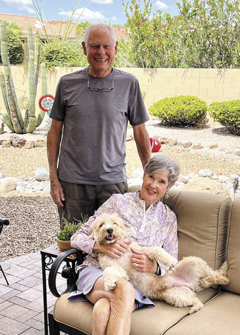 A handsome youngster was found on Lago Del Oro in June. SaddleBrooke residents Julie and Randall Klarkowski offered to foster him while everyone looked for his owner. SaddleBrooke Pet Rescue Network (SBPRN) became responsible for his care while he was being fostered. He was named Curly, and he is approximately two years old and a bundle of love and joy. Unfortunately, his owners were never found after searching for almost two months. To prepare for his future adoption, SBPRN arranged for him to be neutered, vaccinated, and microchipped. Once available for adoption, there was a great deal of interest in Curly. Interviews and home checks were conducted, and there were many excellent candidates. Ultimately, the perfect home was found for Curly with Sharon and Dick Kreutzen. Being a very active couple, they will help Curly expend much of his exuberant energy daily.