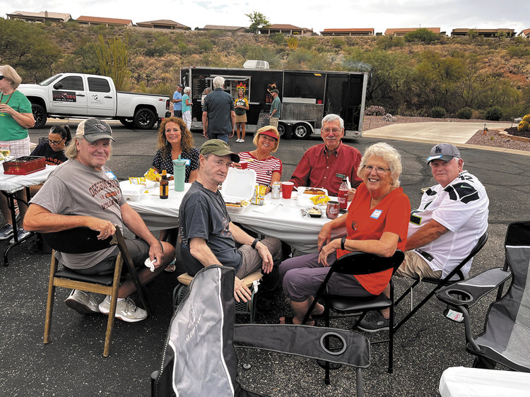 More than 70 residents from Unit 14 in SaddleBrooke took to the streets to enjoy BBQ sandwiches, burgers, and crab cakes served up by Flaming Heart Food Truck. Everyone said their food was fantastic.